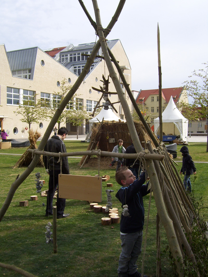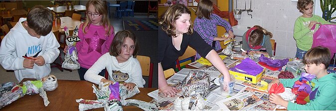 Kinder bauen einen eigenen „Graskopp“, den sie nach der Veranstaltung mit nach Hause nehmen können und pflegen. Sie helfen sich dabei gegenseitig und räumen im Anschluss ihre Arbeitsplätze auf.