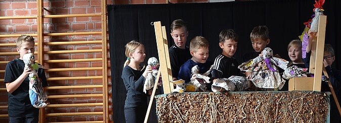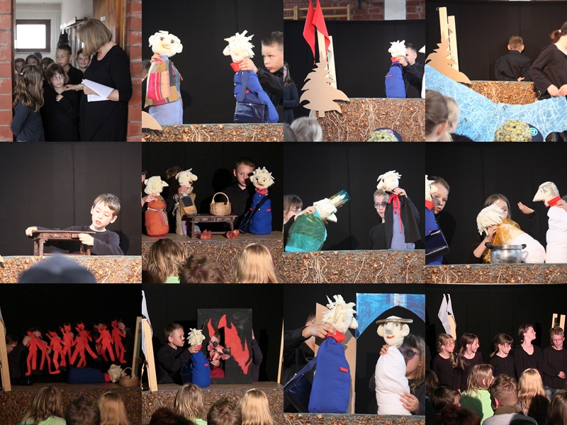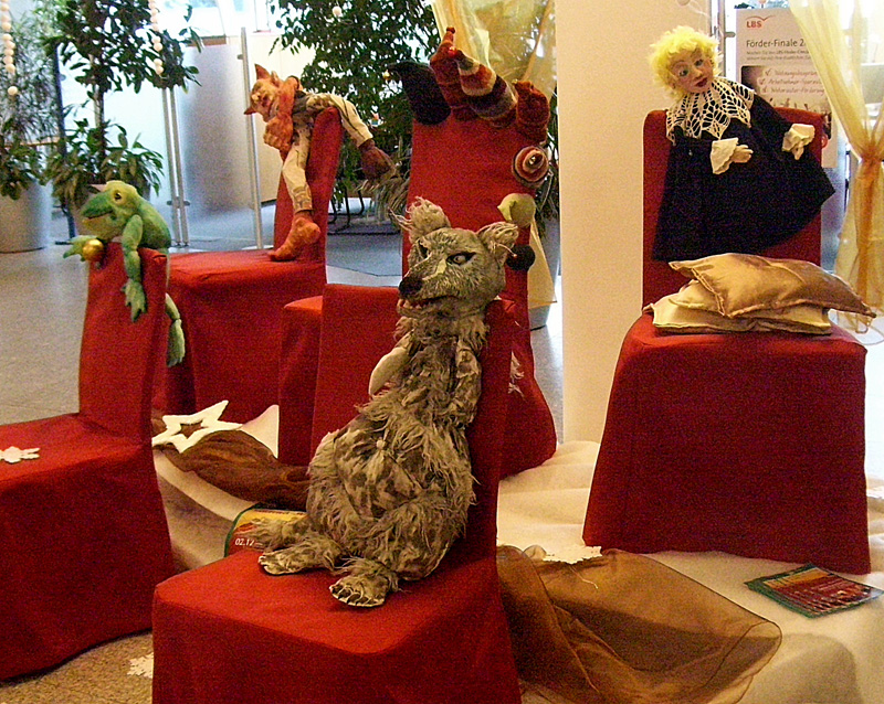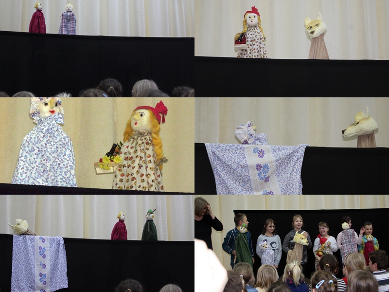 6 Schüler der 2. Klassen bauten Marotten zu dem Märchen Rotkäppchen. Fünf der Puppenbauer und eine andere Schülerin spielten die Figuren bei einer Aufführung zum "Oma-Opa-Tag" der Grundschule am 02. Dezember. Da die Aufführung vor ca. 130 Großeltern, ca. 90 Schülern, den Lehrerinnen und Hortnerinnen der Schule in der Turnhalle stattfand, mussten die Kinder besonders laut und deutlich sprechen und dabei die Figuren über Kopf auf einer Spielleiste führen.